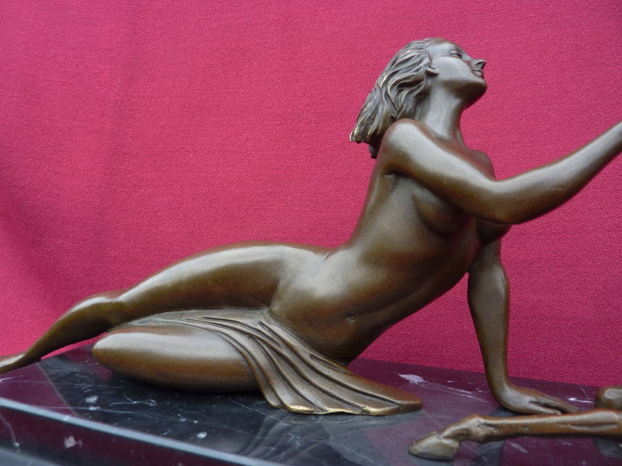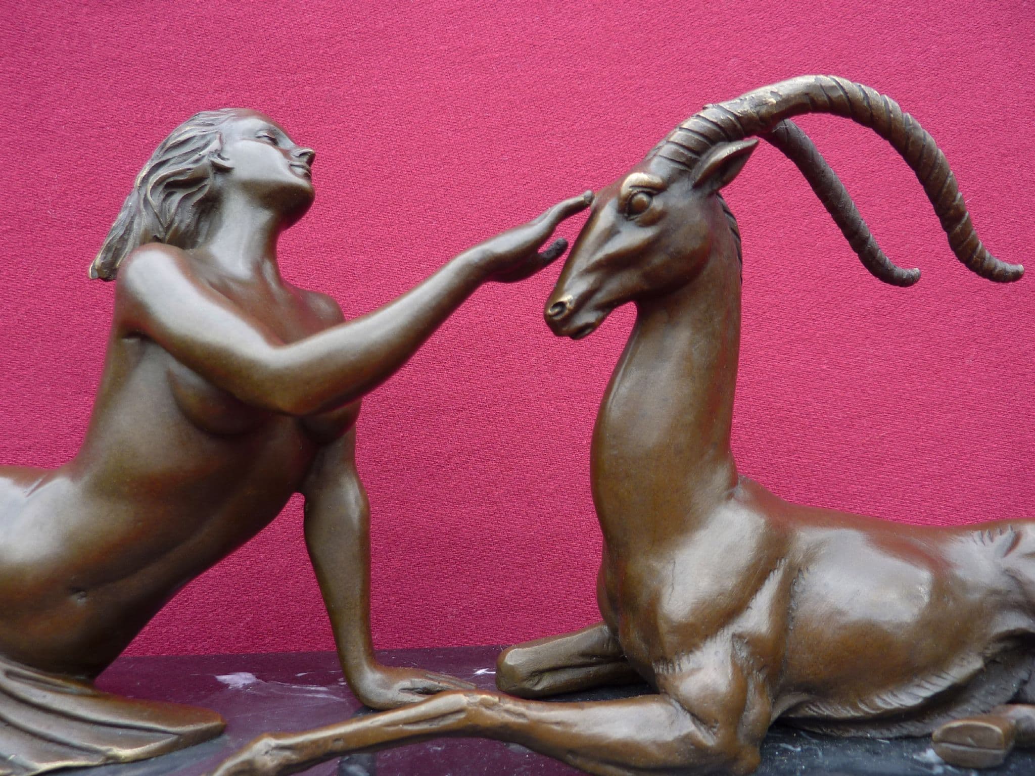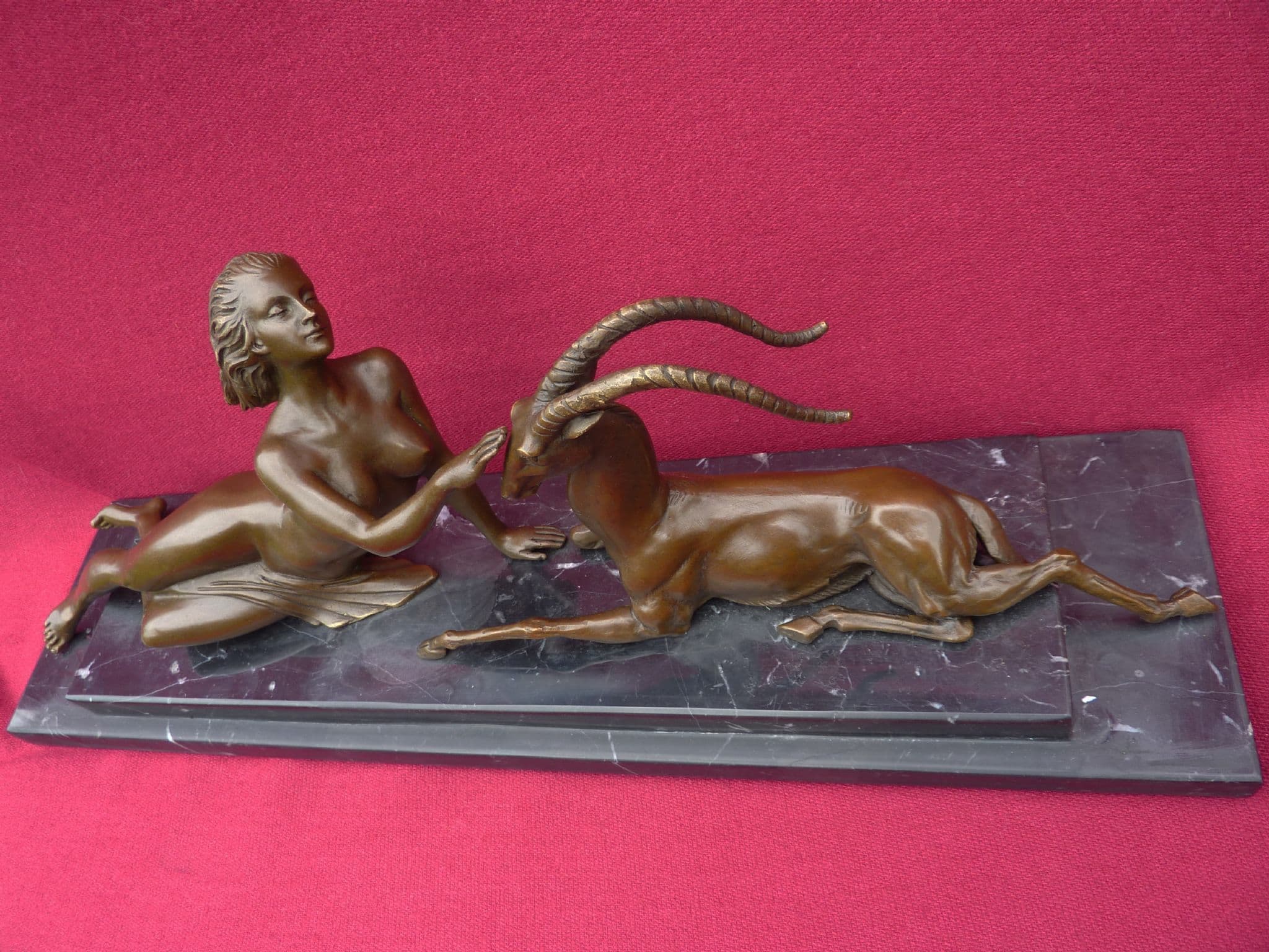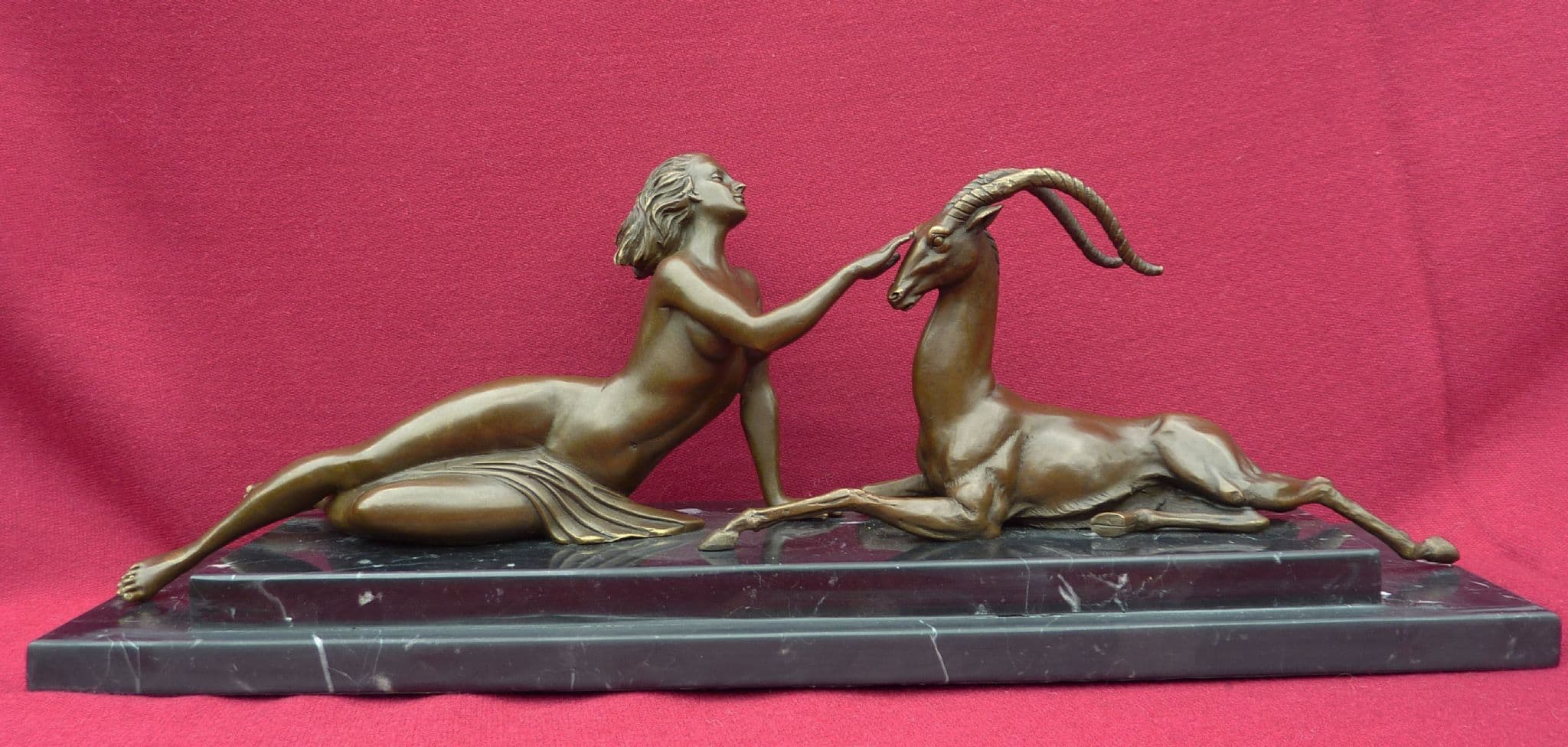 Serene, Pure Bronze, Art Deco, Diana with Gazelle, Amazonian Figurine.